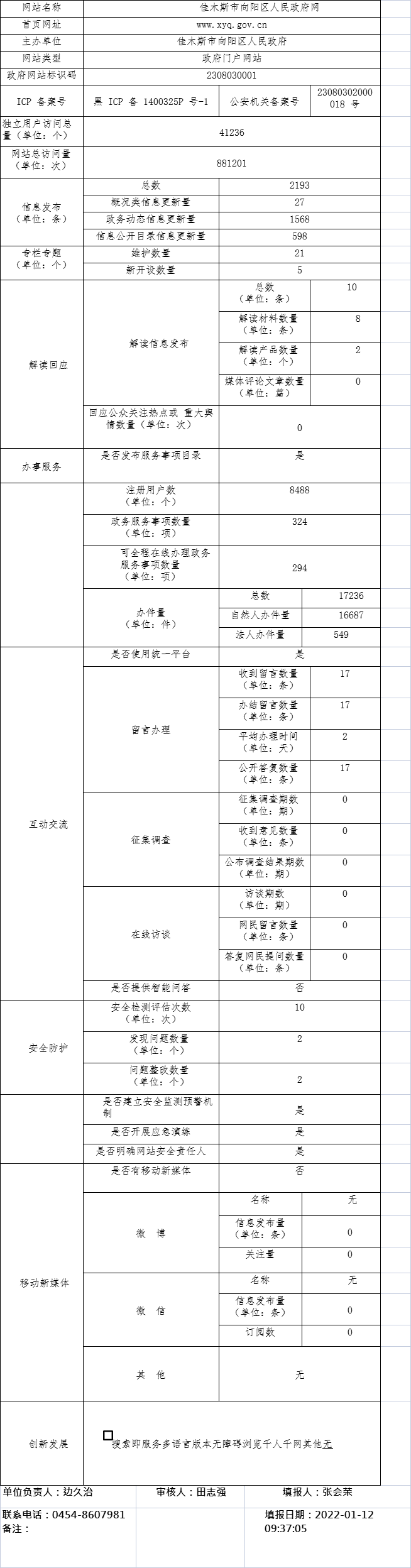 2021年度佳木斯市向阳区人民政府网站工作年度报表